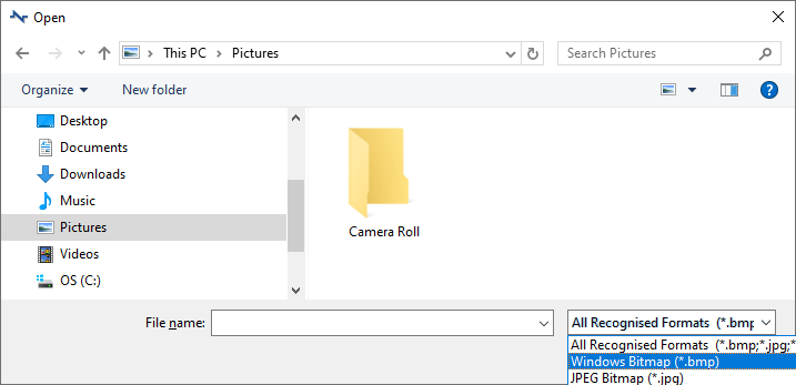 Drop down the Files of type list to view the supported bitmap formats. Choose a specific format to limit the files shown to that format, or use All Recognised Formats to display all files that can be used.