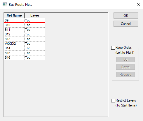 A net name can be removed by selecting it in the list and pressing the Remove Net button, or you can clear the whole list by using the Remove All Nets button. If the order of the names is important check the Keep Order box and use the Up, Down and Reverse buttons to rearrange the net names in the list. The name at the top of the list will be on the left as you add the bus route to the design. Uncheck the Keep Order box if you want order defined by the positional order of the pads, vias or track ends that you are using to start the bus from.