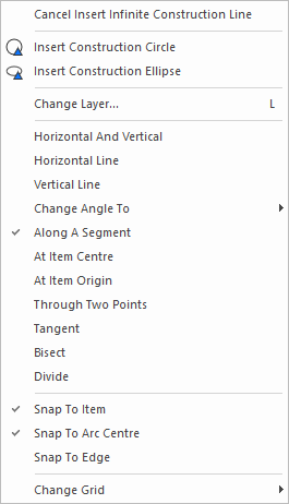 If Snap To Item is being used, check the Snap To Arc Centre option to cause the construction line point to snap to the centre of a selected arc, rather than the nearest point on it.