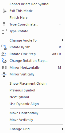 Whilst using the mouse to position the symbol you can use the shortcut menu (shown below) to change its angle and mirror it, amongst other things. This is explained in detail in the Move operation.