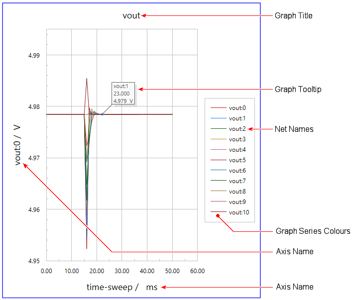 If you wish to overlay two or more signals into one graph, drag a graph over another one, the one you wish to combine it into. Click the ‘host’ graph to complete the combining. You will now see two (or more) lines directing from the originating nets.