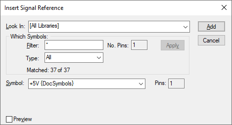 Use this to choose a documentation symbol library to search for the required signal reference. The library list is set up in Library Folders in the library manager. Two special entries exist: