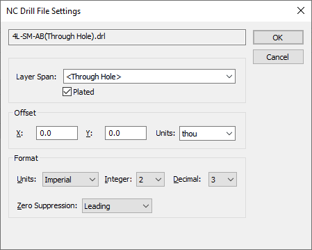 Specify the format of the NC Drill file, the importer will have already taken a guess at the format which if often specified in the header of the file. If you are unsure, take the default, or consult the source of the files. Even if you specify the format incorrectly, the program will attempt to scale the drill data to match Gerber data.