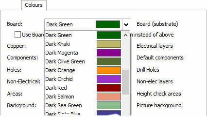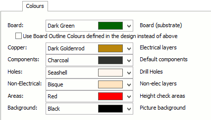 This Colours page is used by the legacy 3D Viewer and is used to set up the colours used to draw the 3D picture (these use different colours to that of the main PCB design).