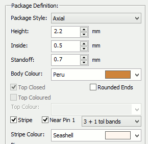 Stripe : Axial and Can components can also be given a stripe on the component body. CAN shapes will get a stripe up the side of the body near to pin 1 or pin 2 depending on the pin 1 checkbox. Axial components get a single stripe near one end or the other, except for Resistors and Inductors which will get the correct set of coloured stripes depending on the value of each component. You can choose to use 3 or 4 bands for the value (plus the tolerance band).