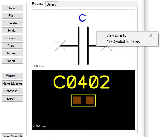You can right click in either of the preview windows and from the context menu, can reset the view using View Extents, and you can use the Edit Symbol In Library option to edit the symbol. If your Part has multiple different gates, then each gate will open in a separate Symbol editor window.