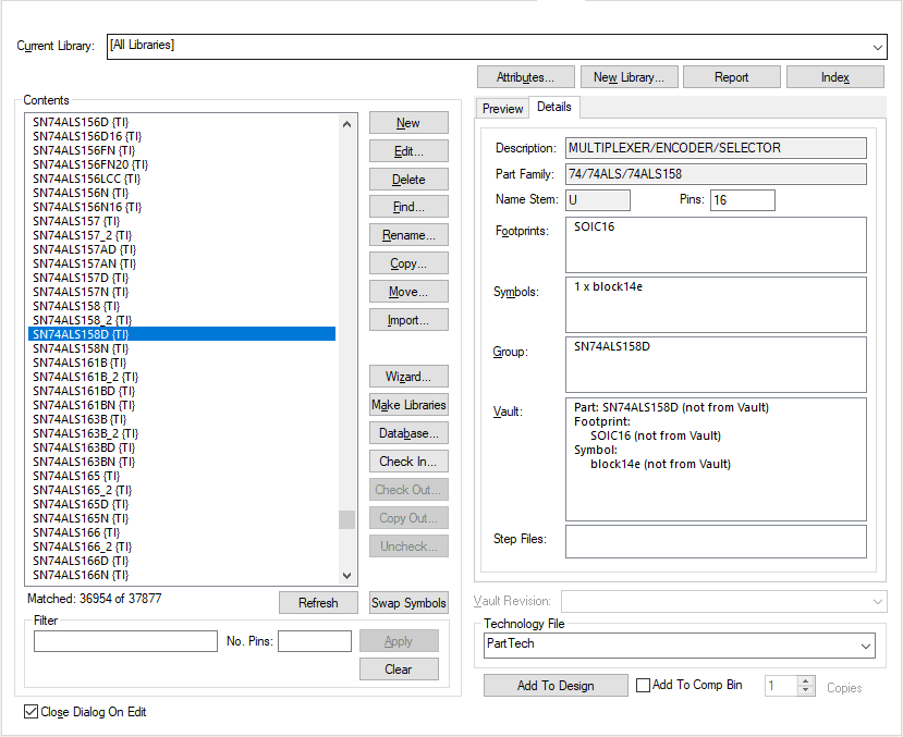 When editing parts, the Technologyfile currently selected in this drop-down list will be used. The technology defines the available attribute names and pin types.