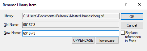 When using this from the Schematic Symbols or PCB Footprints pages, you are given the option to replace any references in existing Parts that use the item you are currently renaming. To do this, select the check box and it will search all your currently enabled Parts libraries for Parts that need to be updated. It will then give you the choice to deselect Parts that you do not want to be updated with the new name.