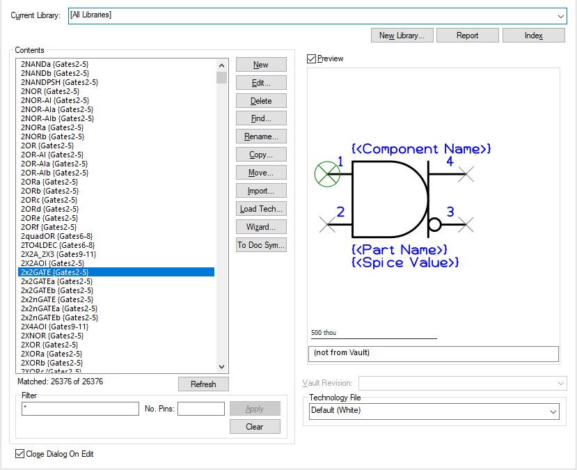 This page of the Libraries dialog provides access to Symbol libraries, allowing you to view and edit the library contents.