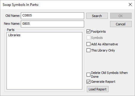 The OK button will start the process and replace all references to the previous Footprint or Symbol with the new names. If the new name list has more items than the old name list you have entered, the Swap Symbol option will replace all Parts with the single new Part name. This enables you to swap out the symbols to multiple old Parts with a single new Part.