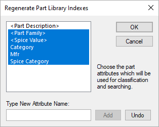 The dialog provides a list of the attributes defined in the current Part Technology, plus any currently used for indexing and any which you choose to add by typing them into the box at the bottom of the dialog and pressing the Add button. You should select those which you want in the index, then press OK to perform the indexing, which may take a few moments.