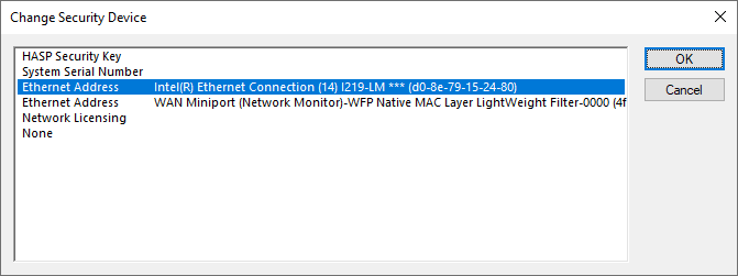 This dialog is used to inspect and change the security device. Your license will be locked to one particular lock type which will automatically be detected by the program from the license file. This dialog is useful if you have multiple possible MAC addresses that can be accessed and you wish to change to a different one listed.