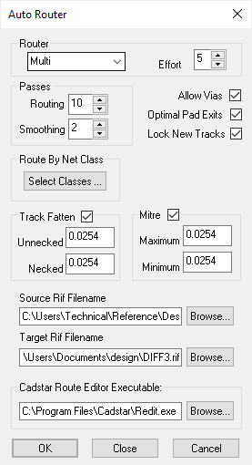 This option invokes the Zuken Autorouter with a set of parameters and options. The router will then run until completion or the number of passes has been exceeded.