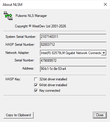 This shows the version of the HASP driver installed, 32 or 64 bit, and whether the key is actually connected. This is verification only and cannot be changed.