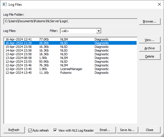 The Log Files dialog allows you to define the log file folder to be used by NLS, and to see what log files are present in the log folder.