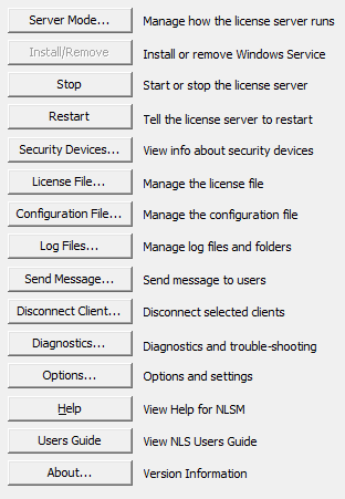 Configuration File | Diagnostics | Disconnect | Introduction to NLS | License File | Log Files | Options | Security Devices | Server Mode | About Dialog | NLSL Program | Licensing NLS