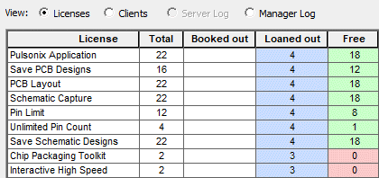 The Licenses view shows you a table of the licenses from the license file, and how many of each license are currently booked out or still available to be booked out.