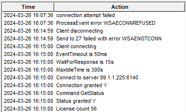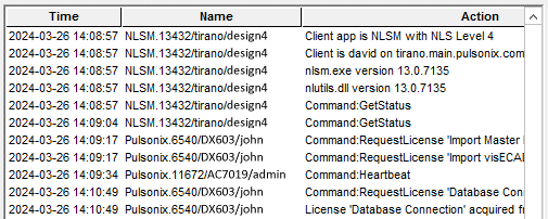 The log file shows you what is happening as the server runs and clients ‘talk’ to the server. This includes information about clients connecting and disconnecting, licenses being booked out and returned, and so on.