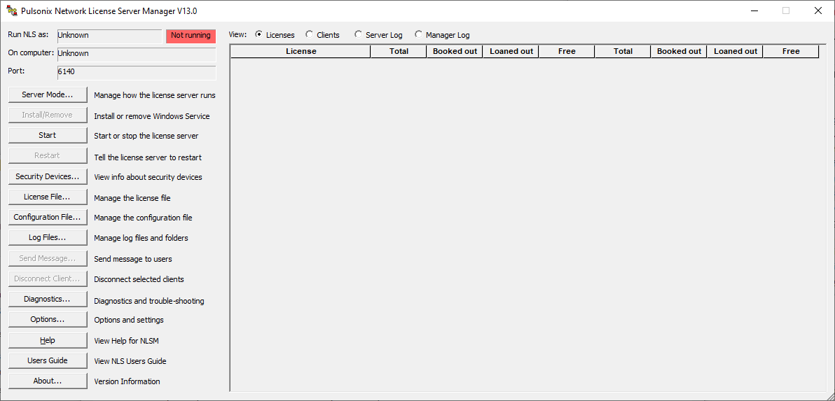 Care should be taken when stopping or restarting the Network License Server when there are still users connected to it. A warning message is displayed if you attempt to do this. If the server is simply being restarted, the server will attempt to re-establish the link to those connected clients/users, but depending on what the client applications are doing there is no guarantee that communication will be successfully re-established in time.