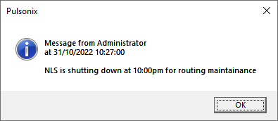 Your message will be added to the message queue for each of the users you have chosen. The next time that the Pulsonix client application that each user is running checks back with the server for any messages pending, they will be retrieved and displayed on the client screen as a popup message box like this: