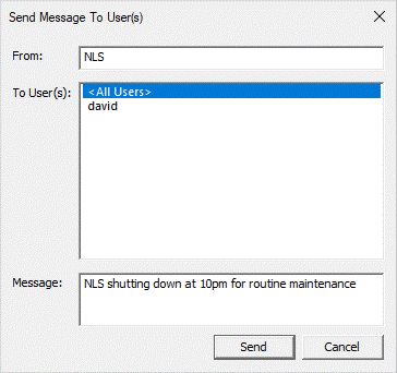 The Send Message dialog allows you to send a brief message to one or more of the currently connected Pulsonix users.