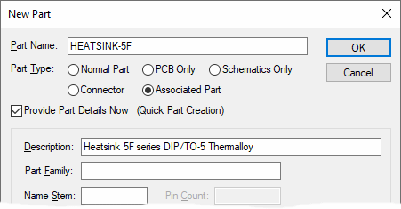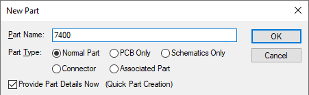Select the Provide Part Details Now box to specify that you wish to enter the details of the part now. The lower part of the dialog (show below) will be displayed to enable entry of part details (footprint name, symbol name etc) for fast part generation. Leave this box unchecked to create a blank part that can have its details entered later using the Parts Editor.