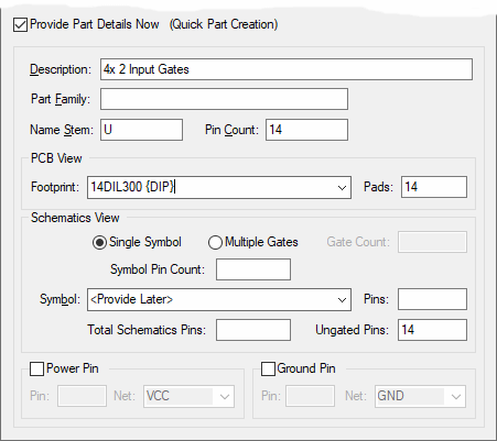 The Power Pin and Ground Pin check boxes enable you to define predefined net names for a power and ground pin on your part. Symbols) can be defined now or, by leaving as <Provide Later>, can be defined later in the Part editor. You can leave either or both for definition later on.