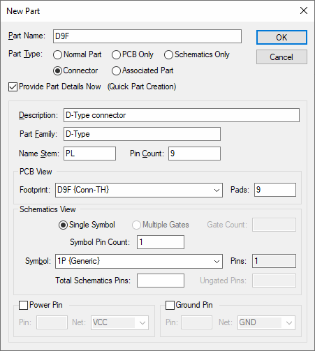 Both the PCB View (for PCB Footprints and Schematic View (for the Schematic symbols) can be defined now or, by leaving as <Provide Later>, can be defined later in the Part editor. You can leave either or both for definition later on. Choose the Pin number and the Net name for each type.