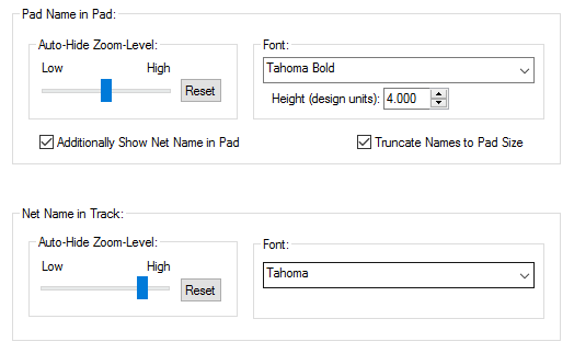 Use this to set up preferences that affect the automatic display of pad names in pads and net names within tracks.