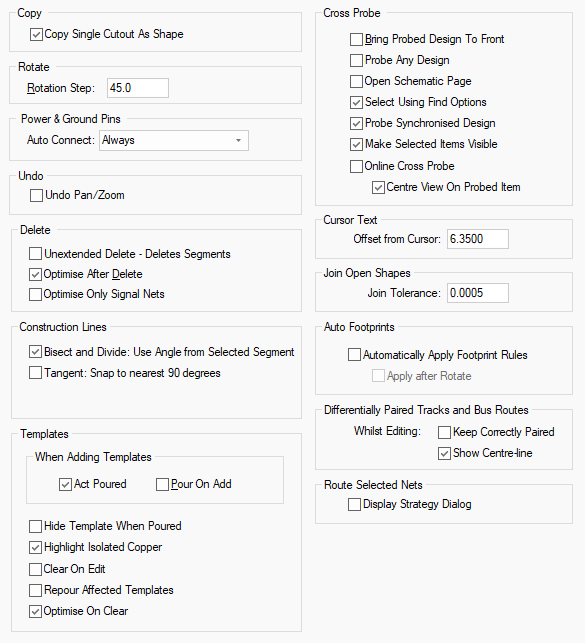 This tab allows you to setup parameters which define how various PCB interaction options behave.