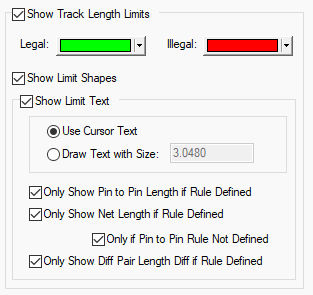 Use this to set up preferences that affect how track length limits are displayed dynamically when adding or editing tracks in a PCB design. These give you a head up visual indication of how long the connection is and how well it complies with any limits imposed by length rules. The limit indicator will dynamically follow the cursor, and continually update.