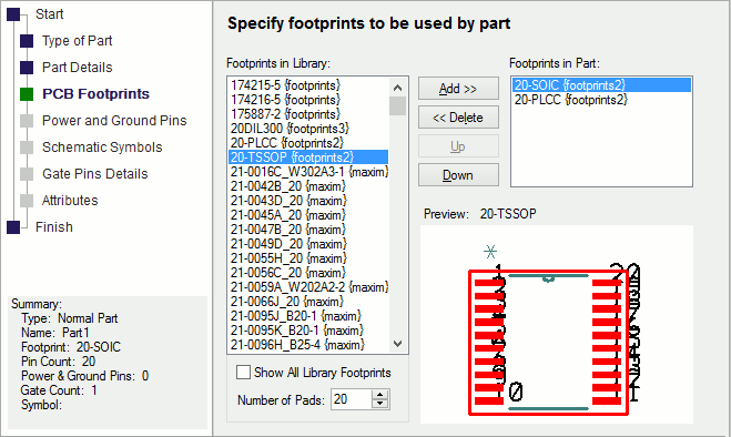 If you do not know how many pads your part has, but know the footprint name, check the Show All Library Footprints box. The Footprints in Library list will be updated to show all available footprints. When you select a footprint in this list, the pad count in the Number of Pads field will change to show the pad count on the selected footprint. As soon as you add a footprint to the part (see below) the Footprints in Library list will change to only show footprints with the same pad count, ready for selection of alternative footprints for the part.