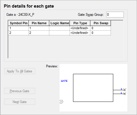 The grid shows the pins for one gate at a time. The gate name and the symbol name are shown above the grid to help you track which gate you are working on. Press Previous Gate and Next Gate to move between gates of the part. When on the first gate, use the Apply to All Gates button to copy the settings for the pins on this gate to all other gates on the part. You can also invoke Apply to All Gates by right clicking on the grid of pin details.
