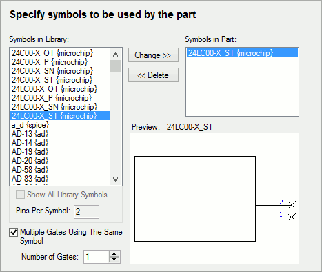 The right-hand list shows the symbols to included in this part. Select a symbol from the Symbols in Library list and press Add (or double-click on the symbol name) to add this symbol to the part. If Multiple Gates Using The Same Symbol is checked, the specified number of gates will be added and the Add button modified to be Change. Pressing Change will replace all gates in the part with multiple copies of the symbol selected in the Symbols in Library list.