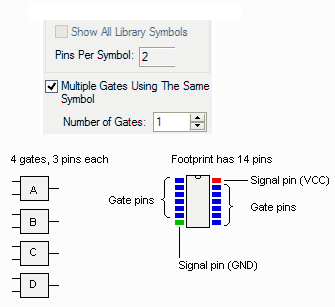 The diagram below shows how the pin counts might be specified for a new part. This part uses a 14-pin footprint, and four 2-input gates each with three pins. The two remaining pins (those not used by the 12 gate pins) are signal pins, and are used to specify the power and ground pins of the part. These signal pins then do not appear on the Schematic drawing, but are automatically connected up when the component is added to the PCB design (if the specified nets exist in the PCB).