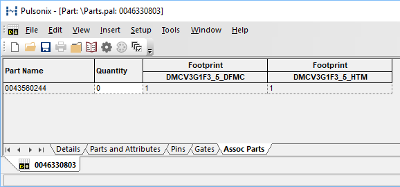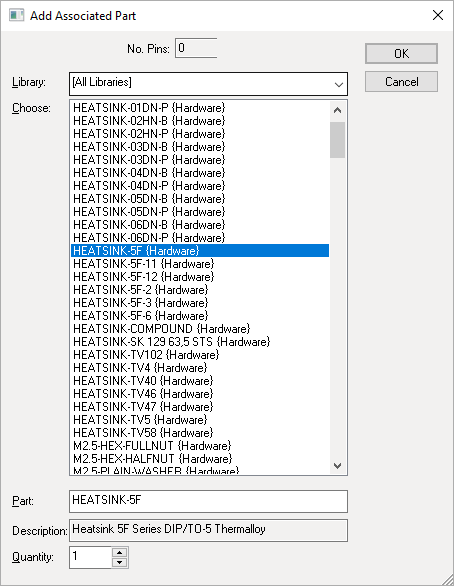 The minimum information for an Associated Part is a Name and a Quantity. The Associated Part can be, but does not have to be, defined in the library. The Associated Part will not have any pins defined, but can have a description and attributes.