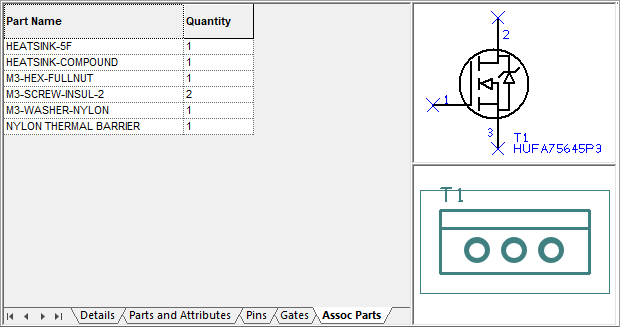 Associated Parts do not physically appear in the Schematic or PCB designs, but do appear in the Parts list or bill of materials (BOM. These are useful for adding screws, heatsinks, sockets, thermal compound etc.,which must always be present when a Part is used in a design.