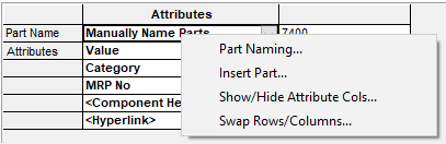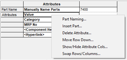 If you prefer, you can swap the rows and columns in this dialog so that the Attributes list is shown vertically rather than horizontally. Do this by selecting the Swap Rows/Columns option from the context menu when right clicking in the Attributes grid. This might be more convenient if you are using a lot of attributes. This has no effect on the data stored in the part.