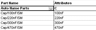 On returning from this dialog, the top left cell of the grid will be changed to “Auto Name Parts” to show how the parts are named, and the actual part names will be reconstructed using the rules specified. In this case, each capacitor gets its name from the text items we have defined, together with the attribute which specifies its value.