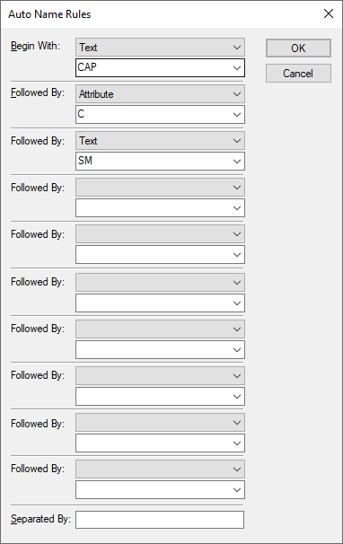 Now, specify the rules for how the parts should be named. You can choose up to four fields in constructing the name, together with any text separator you would like between the fields. In this example, the name starts with the text string “Cap”, then the value of the “C” attribute, and then the text “SM”. A separator ”/” has also been specified, and will be inserted between each of the fields.