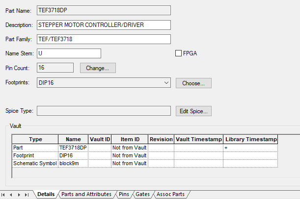 If the Vault is in use, the Vault section will show vault details for the part and its footprint and schematic symbol.