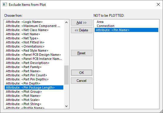The dialog contains two lists. On the left is a list of design items, named groups and attributes which could be excluded from the current layer or page. On the right is a list of items and attributes which are currently excluded and will not be plotted. You can move items between the two lists using the Add >> and <<Delete buttons.