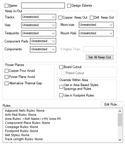 The Edit Rule button is used where dialogs have rules associated with them. You can select a rule in the list and the Edit Rule button will be enabled. Pressing the button will apply the Property page, quit the dialog and run the corresponding rule page in the Technology, with the appropriate rule selected.
