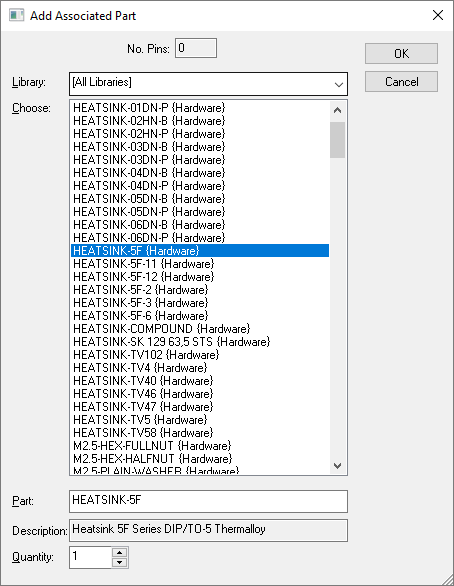 The Quantity field defines the number of this associated part which are required. Obviously, the quantity should be at least 1. For Schematic or PCB designs, it should be more than the minimum required to satisfy the parts already used in the design. An error will be given if this is not the case.