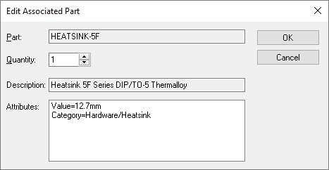 Associated Parts are added to Parts or Designs to define items which are not physically present in the Schematic or PCB design, but which should appear in the netlist. These are useful for adding screws, heat sinks, sockets, etc.