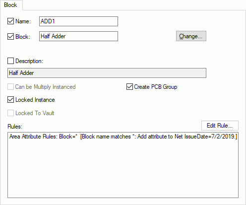 Create PCB Group, if checked, will cause a group to be created in the matching PCB. The group will contain all the components inside the block instance. The group will have a name made up of Block Group Name Prefix as defined in the PCB technology Block defaults, followed by the Block Instance name.