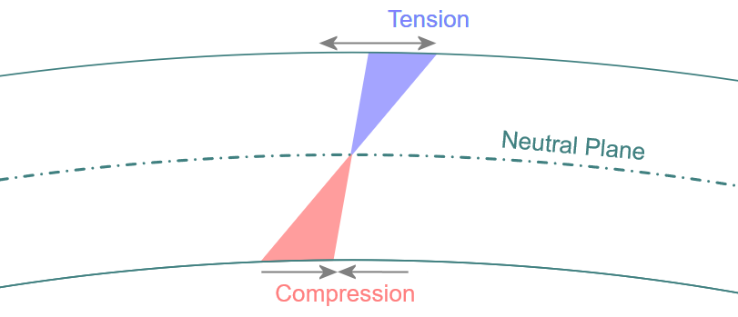 The Neutral Axis is a plane within the surface of the shape, such that when the material is bent, the plane does not undergo any tension or compression, and so is the ‘true’ length of the bent shape. The image below illustrates this: