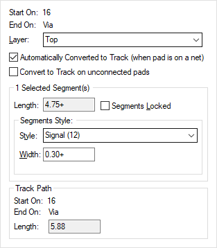 Automatically Converted to Track - when checked will cause the breakout to be immediately converted to a track when the pad is added to a net. This option works in conjunction with the Convert Breakouts to Tracks option in the PCB design. (see Breakouts).