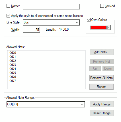 This properties tab is available when using the properties option on one or more selected bus segment(s). Use it to change the selected bus line style and allowed nets.