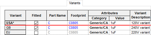 The Variants page of the Component Properties dialog is displayed when the design has variants defined. It shows which variants the current component is fitted in and if there are part variants. The rule is that the bare board will be constant across all variants, so all pads, tracks and copper will always appear.